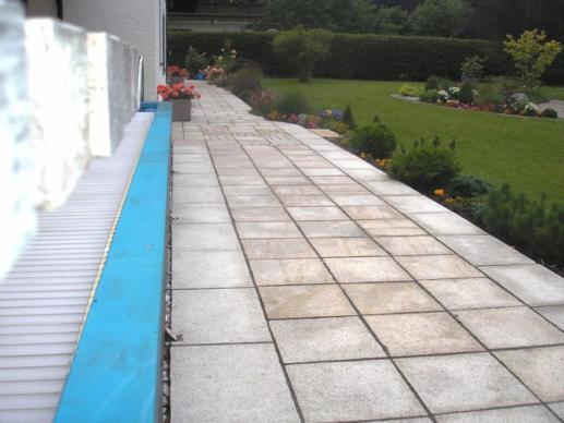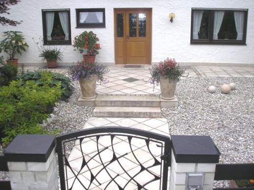 Bei dieser Projekt haben wir den gesamten Weg ums Haus mit chinesischem Granit belegt und mit einem festen aber dennoch wasserdurchlässigen Mörtel verfugt. Selbst die Treppenstufen sind aus demselben Material.