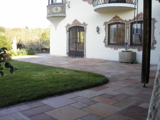 Diese Terrasse ist mit Quarzit-Rechteckplatten belegt und mit wasserduchlässigen Kunstharzmörtel ausgefugt.